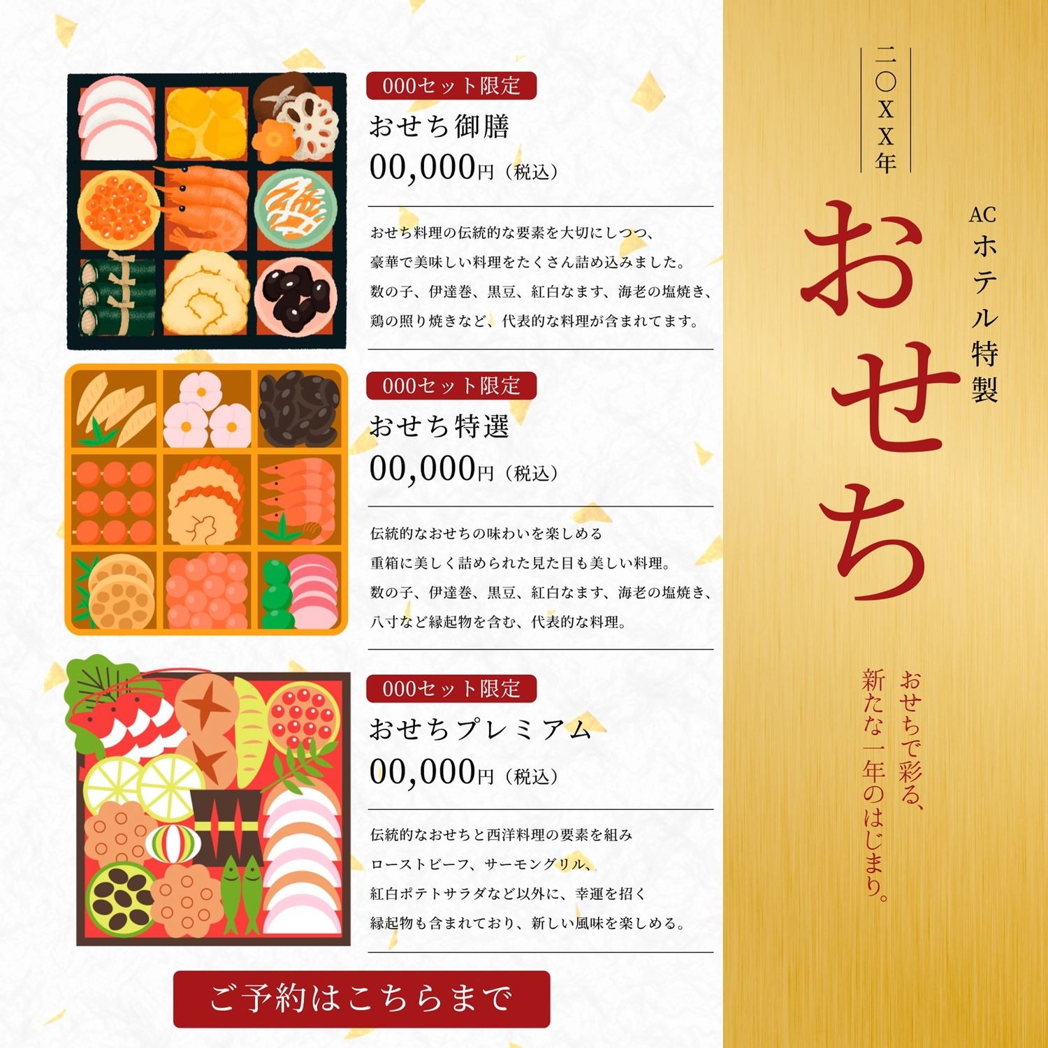 金色背景のタイトルとおせち料理の俯瞰イラストのホテルのおせち予約のInstagram広告の無料Instagram投稿テンプレート 17219 -デザインAC。