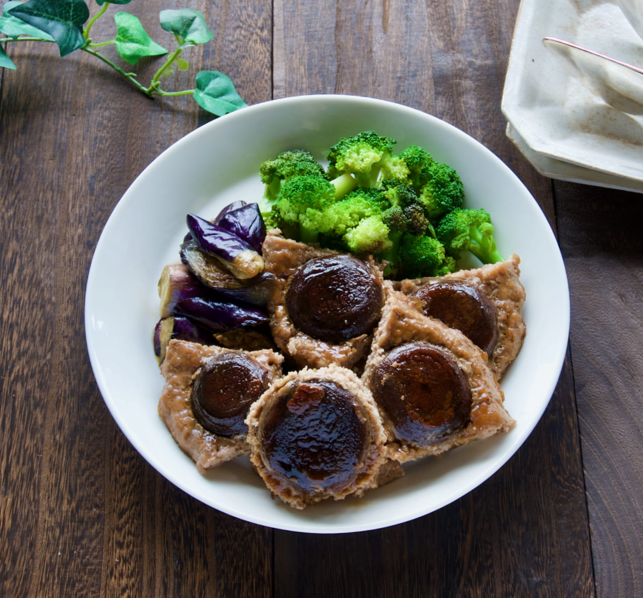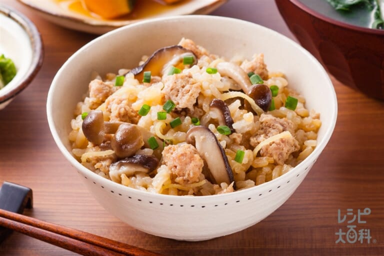 肉詰めしいたけの献立 主食:鶏ひき肉とごぼうのだし炊きご飯、汁物:チンゲン菜とかぶの味噌汁 献立・メニュー 味の素パーク たべる楽しさを、もっと。