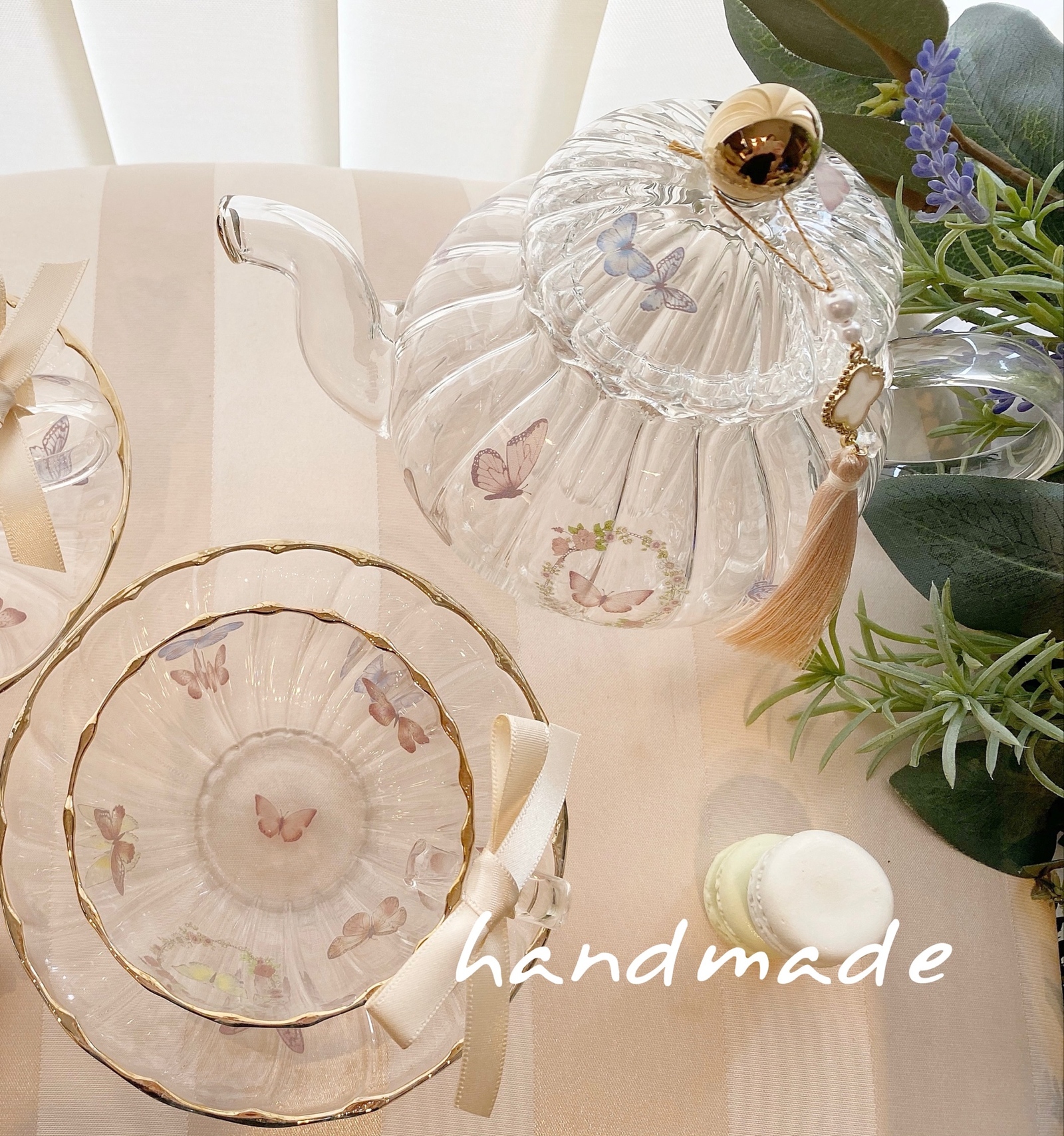 再再再販☆ポーセラーツ ガラス ティーポット+カップ&ソーサー2客セット+タッセル付き♡ - KYO-PLAISIR'S GALLERYminne byGMOペパボ 国内最大級のハンドメイド・手作り通販サイト。