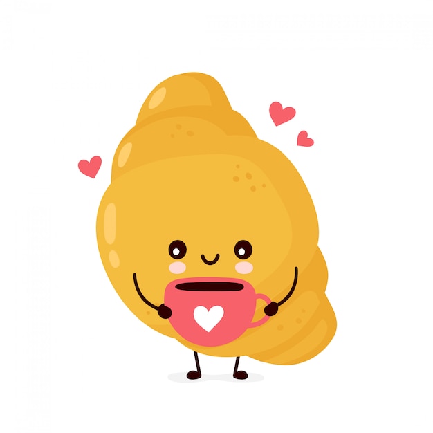 コーヒーカップとかわいい幸せなクロワッサン。フラット漫画キャライラスト。白い背景で隔離されました。おいしいクロワッサンのコンセプトPremiumベクトル素材。