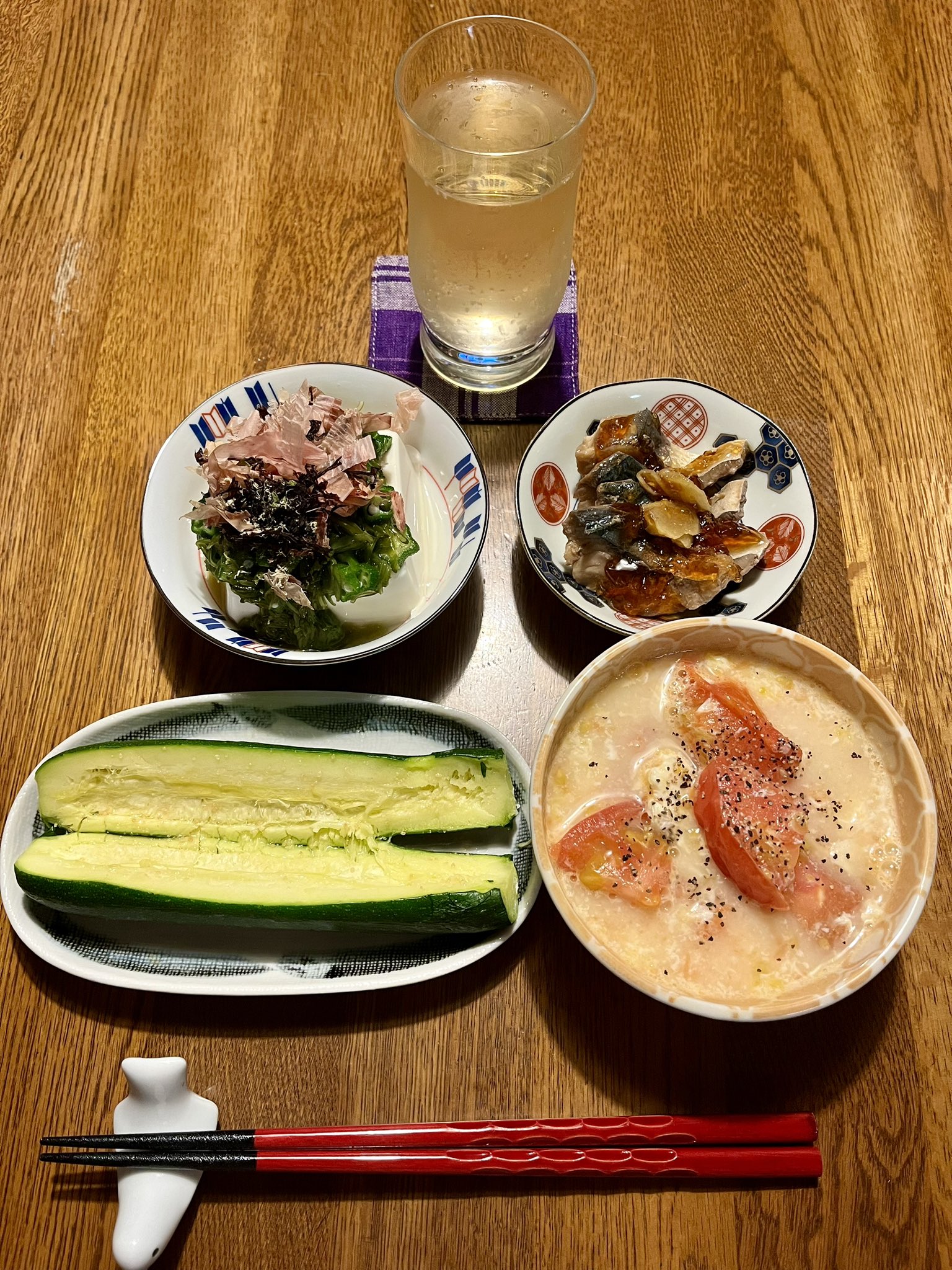 カメヤマくん🐭🦒 on X: "本日のノンアルお晩酌 蒸しズッキーニ オクラめかぶ奴 ゴマサバの生姜煮 トマトの卵スープhttps:t.co nAYldirlib"X。