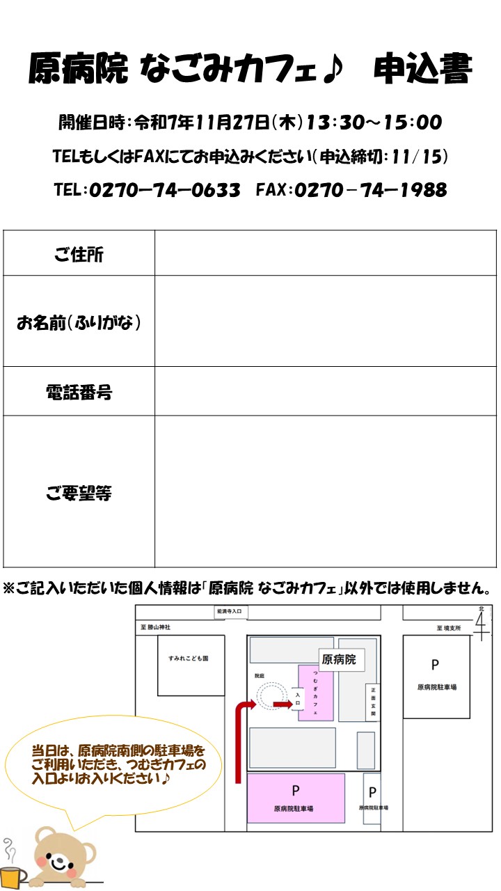 11月の「原病院 なごみカフェ♪」について - うつ病 鬱病 ・精神科の原病院 群馬県 伊勢崎市、埼玉、栃木、東京。