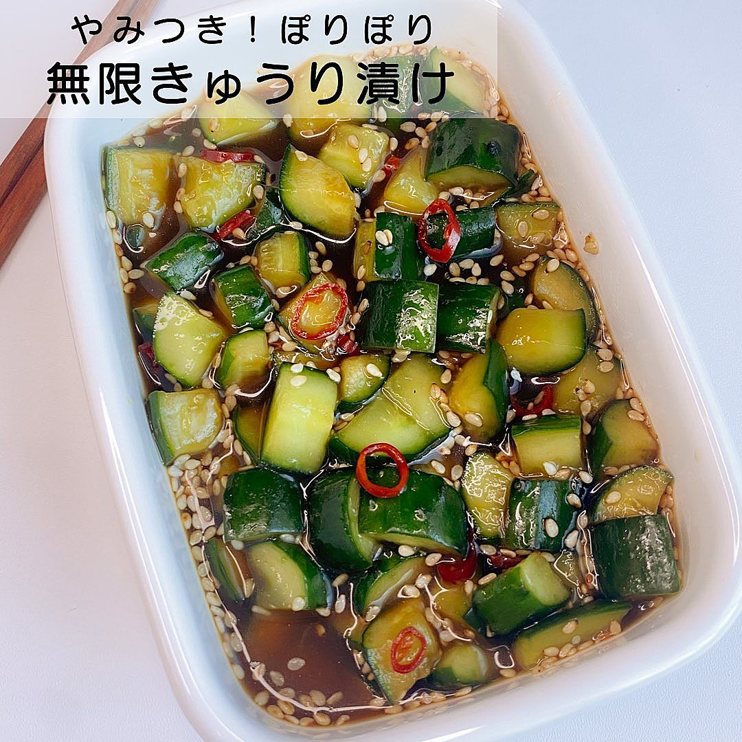母ちゃん直伝「ポリポリきゅうり漬け」 370万回再生中♪無限きゅうりのピリ辛verです😋材料 約2人前▷きゅうり:3本 ▷砂糖:小さじ1 ▷ 鶏ガラスープの素:小さじ1 ▷醤油:大さじ5 ▷水:大さじ3 ▷酢:大さじ1〜2 ▷ごま油:小さじ1 ▷一味唐辛子:適量。