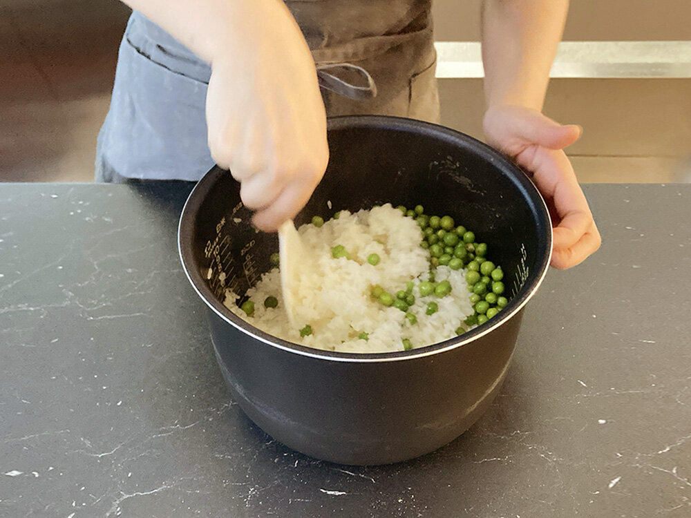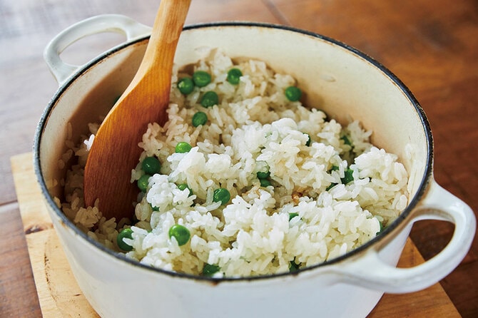 豆もいっしょに炊いて風味豊かに。グリーンピースごはんのレシピセブンプレミアム公式。