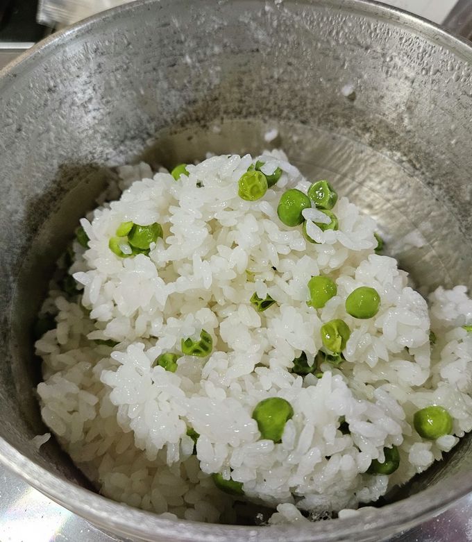 冷凍グリンピースで豆ごはんを炊きました2025 4 7料理簡単レシピcookingfood自炊レシピ炊き込みご飯豆ごはんグリンピースご飯。