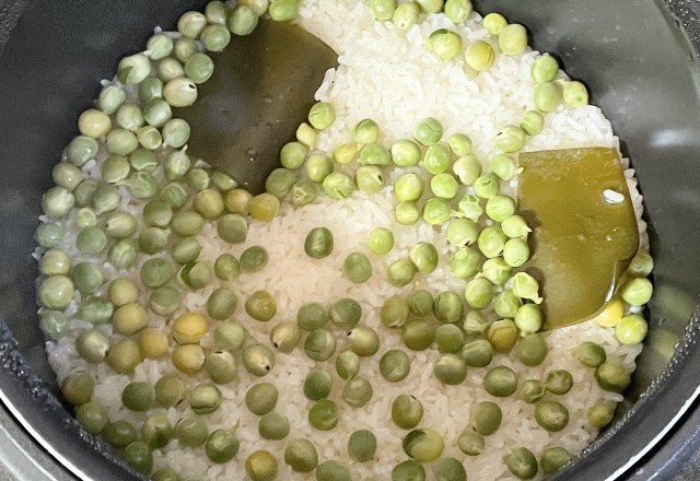 後入れ 冷凍グリーンピースをご飯に混ぜるだけ!ご飯2合の簡単な豆ご飯を紹介。