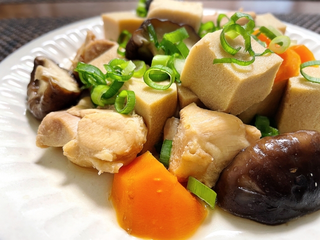 高野豆腐の煮物・鶏肉、椎茸入り こうやどうふのにもの・とりにく、しいたけいり- きっちんさんの簡単料理。