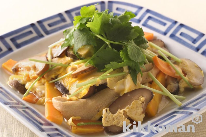 高野豆腐としいたけとにんじんの卵とじ ほっとする人気の甘辛味。