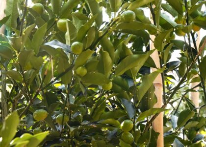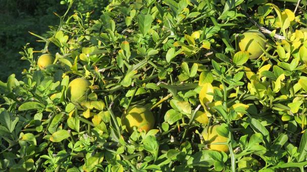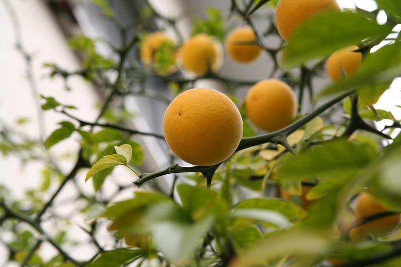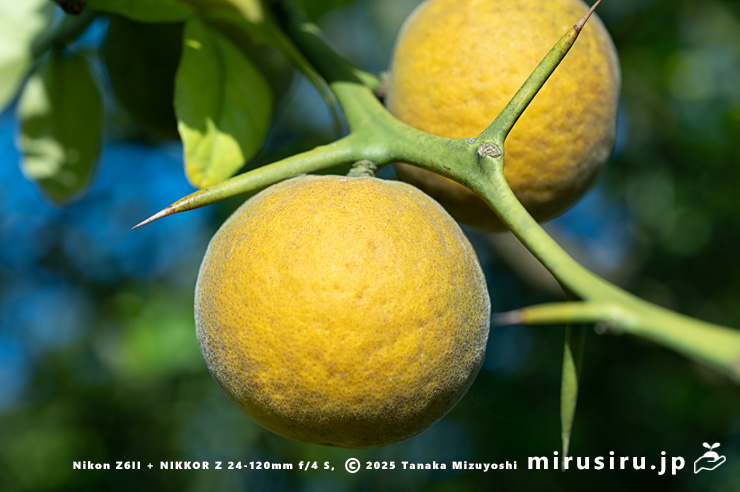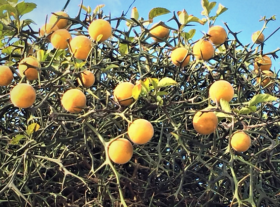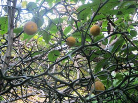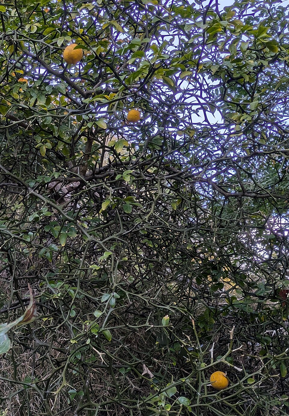 トゲトゲの木は、、、 トゲがいっぱいの木。すだちのような実がなっている、、 正体はカラタチだそうで、アゲハチョウの幼虫はカラタチの葉を食べるそうです。幼虫ではありませんが、しばらくの間アゲハチョウがカラタチの周りを飛んでいました。 実は苦味があって食べる。