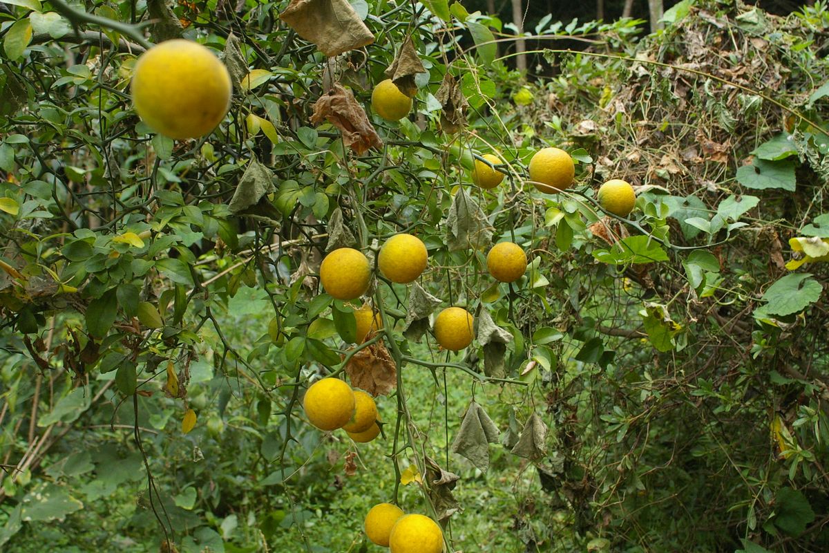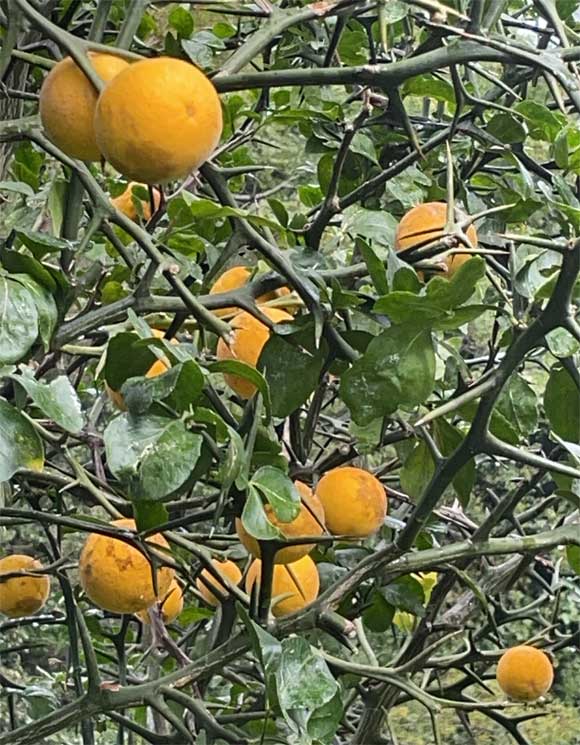 1本の木にキンカンとカラタチの実が。樹下のひととき。