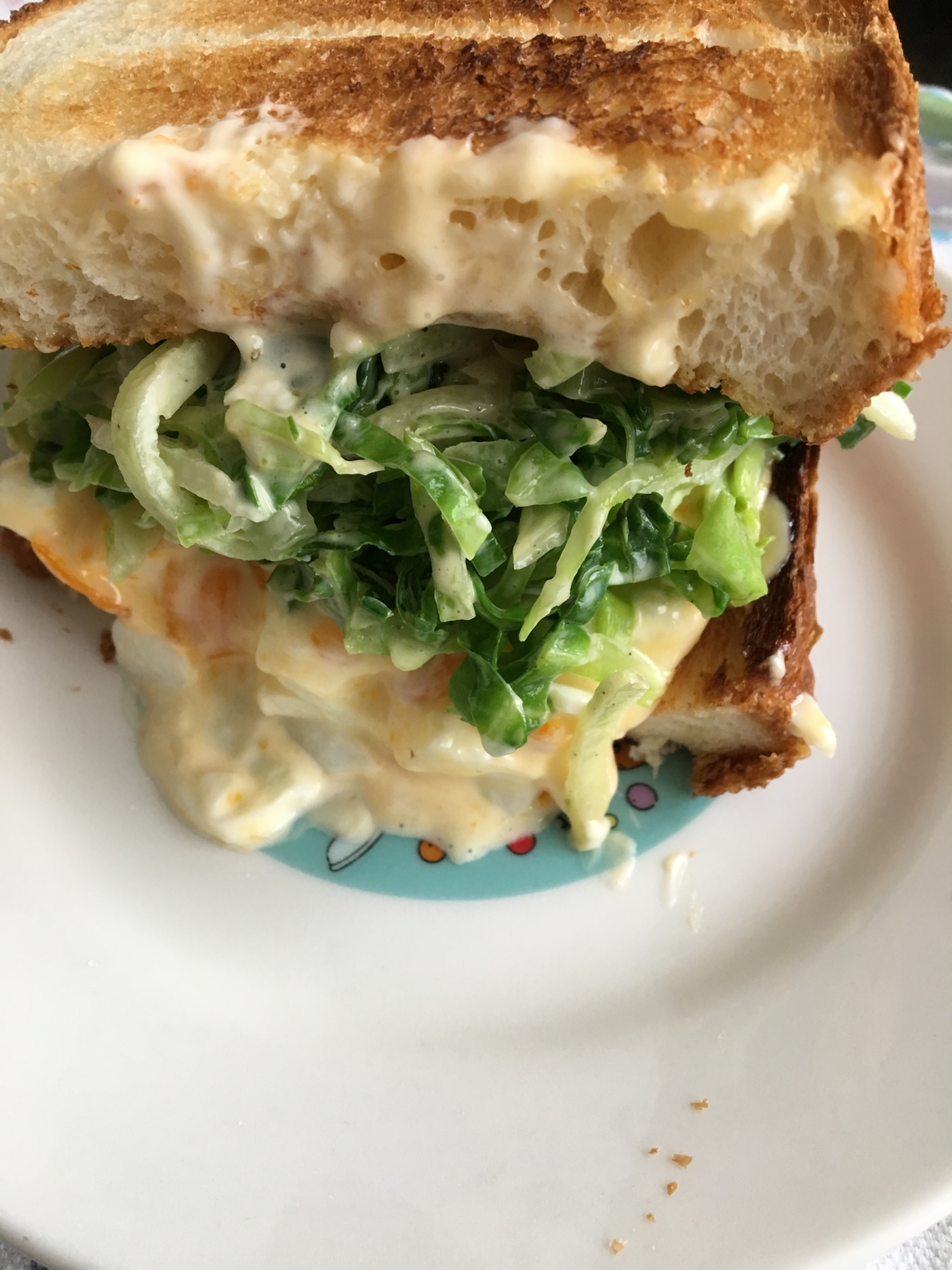 フライパンで作るホットサンド卵・チーズ・ハム・キャロットラペ・紫キャベツのマリネ ルッコラ・マヨネーズ・ ・ ・フライパンで ホットサンドサンドイッチ萌え断 萌え断サンド朝ごパン 38ごぱんsandwich breakfast。