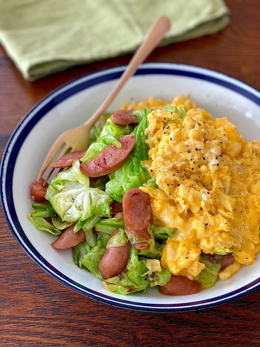 簡単大満足♪ 春キャベツとウィンナーのふわとろ卵。