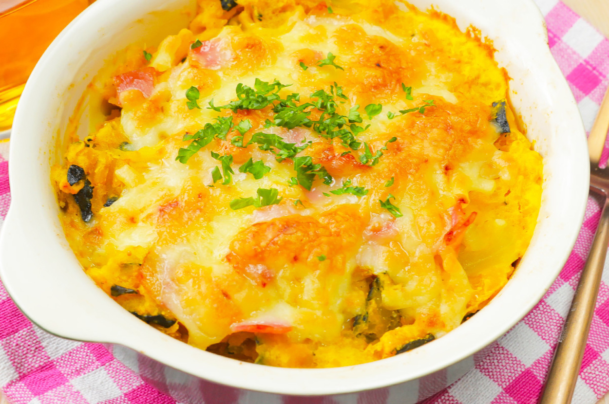 生ハム、坊ちゃんかぼちゃのマカロニグラタンのレシピ。