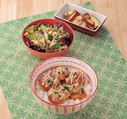 鶏肉の照りマヨ丼 カラフルサラダレンジおさつ煮 食材宅配のヨシケイ 夕食ネット レシピ・メニュー・献立付き。