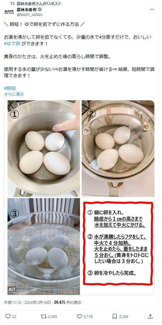 農林水産省 on X: "\ 時短! ゆで卵を茹でずに作る方法お湯を沸かして卵を茹でなくても、少量の水で4分蒸すだけで、おいしいゆで卵ができます! 黄身のかたさは、火を止めた後の蒸らし時間で調整。 使用する水の量が少ない⇒お湯を沸かす時間が省ける⇒ 結果、短。