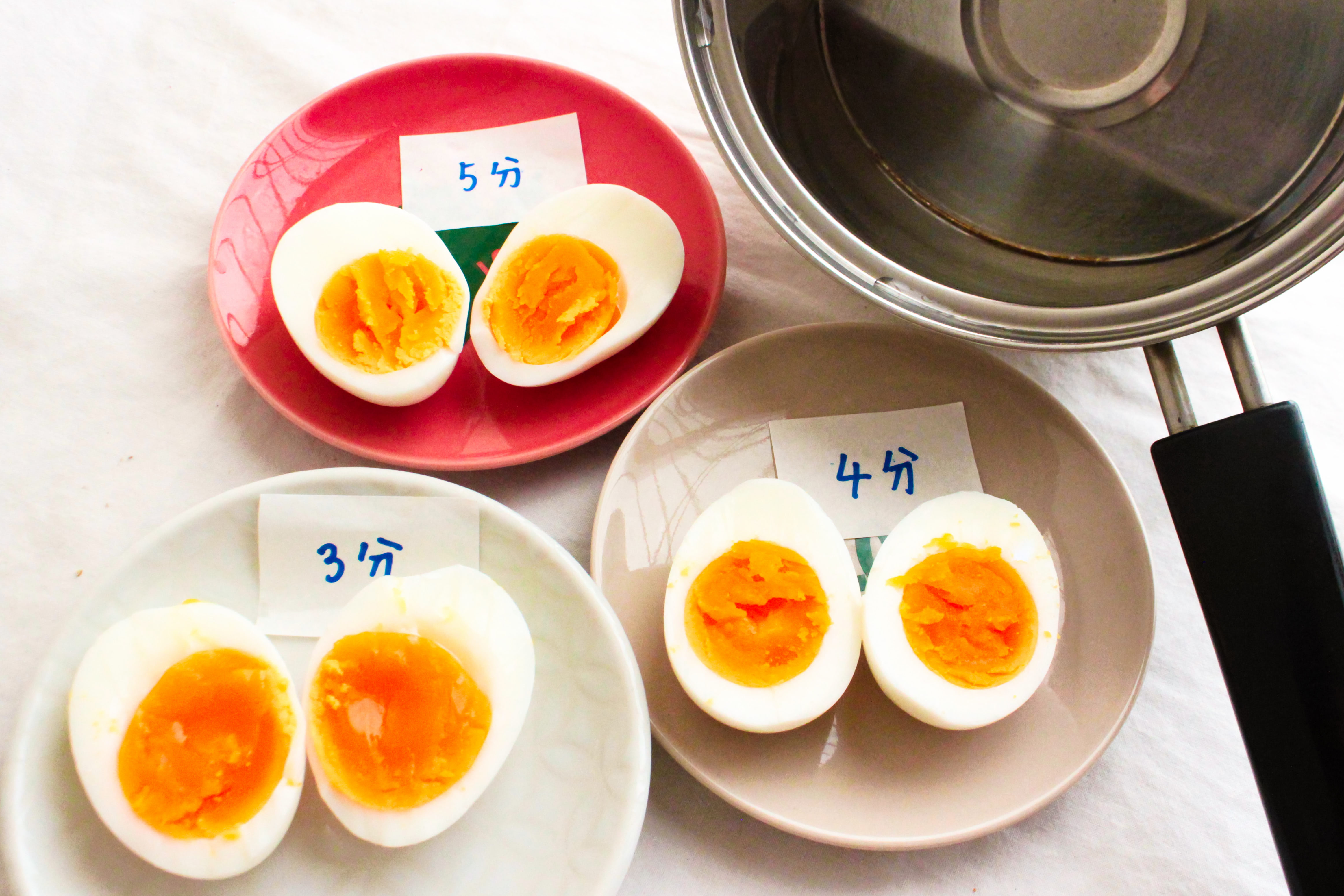 農林水産省 on X: "卵を4分加熱したあと、鍋に蓋をしたまま3分おくと、黄身はトロトロに 画像上5分おくと、黄身はほどよいかたさになります 画像下 。 担当はいつも置き時間5分バージョンで作っています。https:t.co F9IZeBhisq"X。