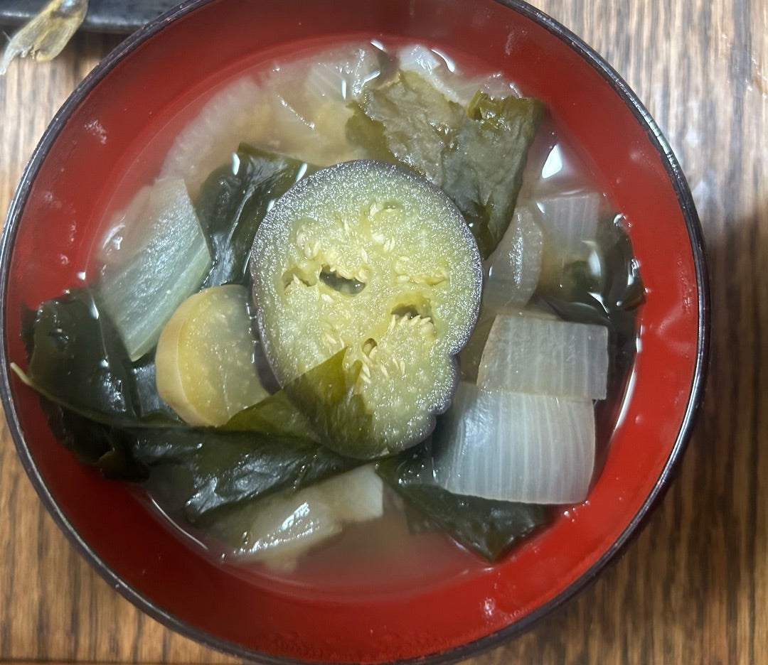 玉ねぎと茄子とわかめの味噌汁Happy Life♪ いつまでも楽しい食事を。