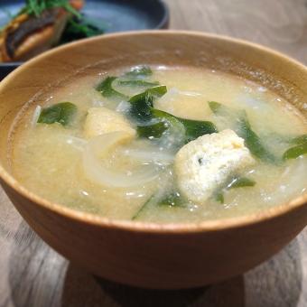 玉ねぎとワカメの味噌汁 - 海水100% 天日と平釜 日本の伝統海塩 「海の精 うみのせい 」。