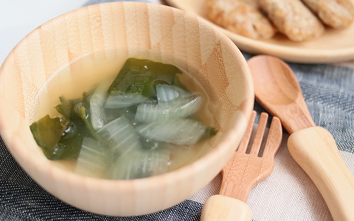 家族の栄養を支える 基本の食事シリーズ「新玉ねぎとわかめの味噌汁」:スクスクのっぽくん。
