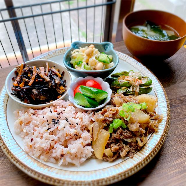 肉豆腐、わかめと玉ねぎの味噌汁献立。カリッとした毎日。