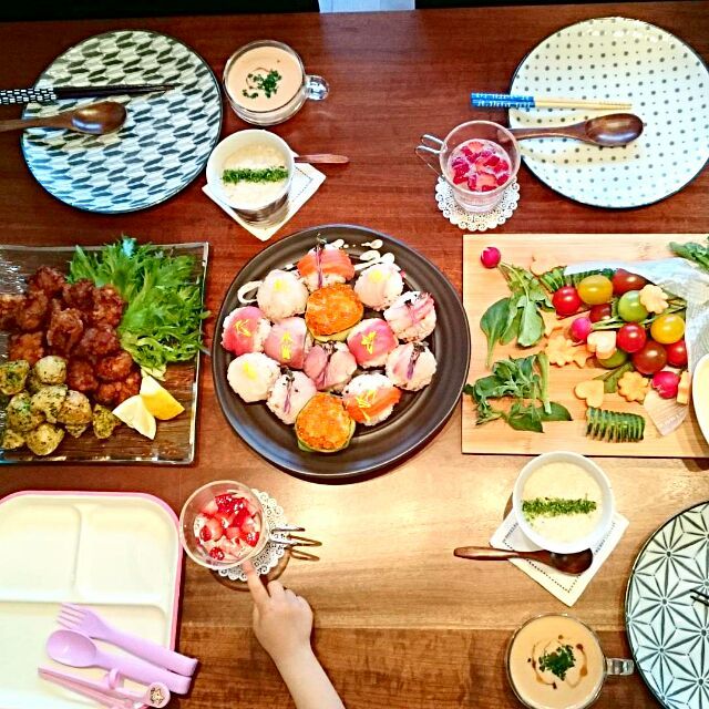誕生日ごはん 手巻き寿司 唐揚げ ナポリタン ミニトマトハニーマリネ 春雨サラダかいかい❤︎お鍋ガールズ。