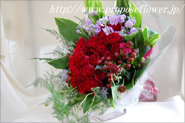 バラとアスパラガスのエアリーな花束プロポーズフラワーショップ。
