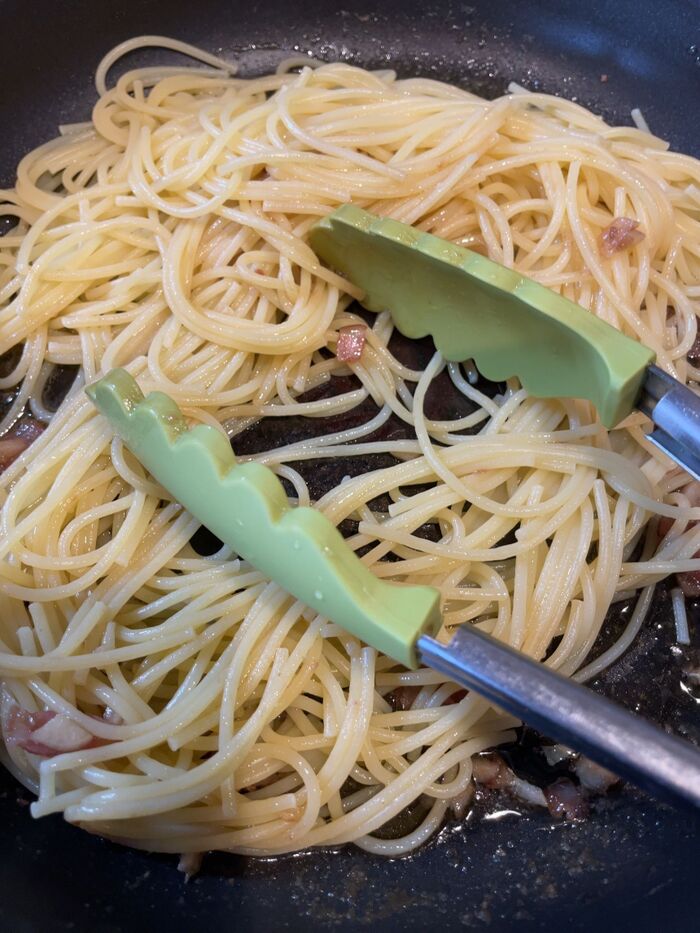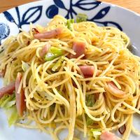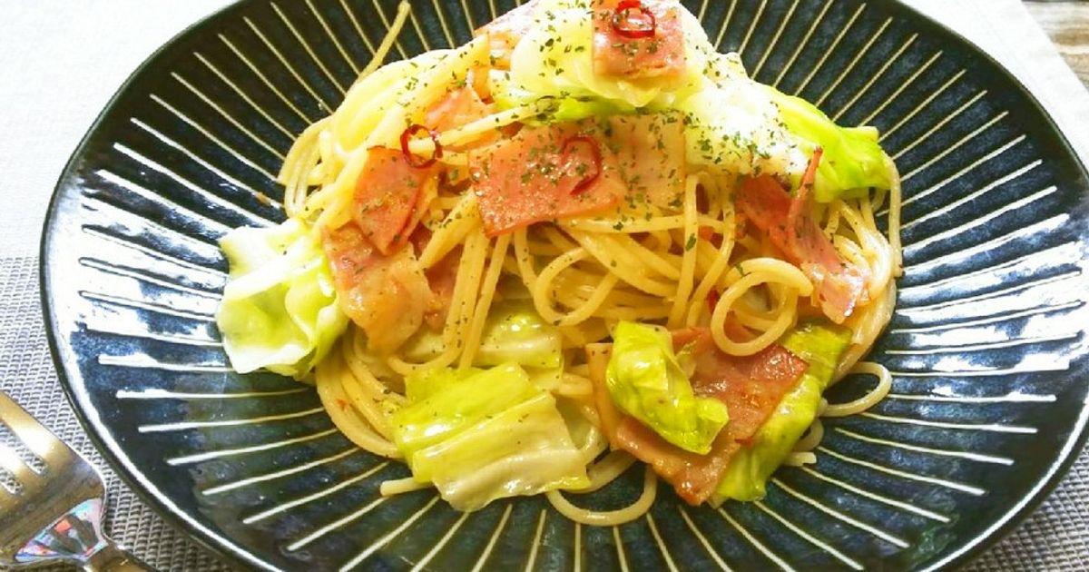 春を感じるおうちパスタ!春キャベツと厚切りベーコンのアンチョビペペロンおうちごはん。
