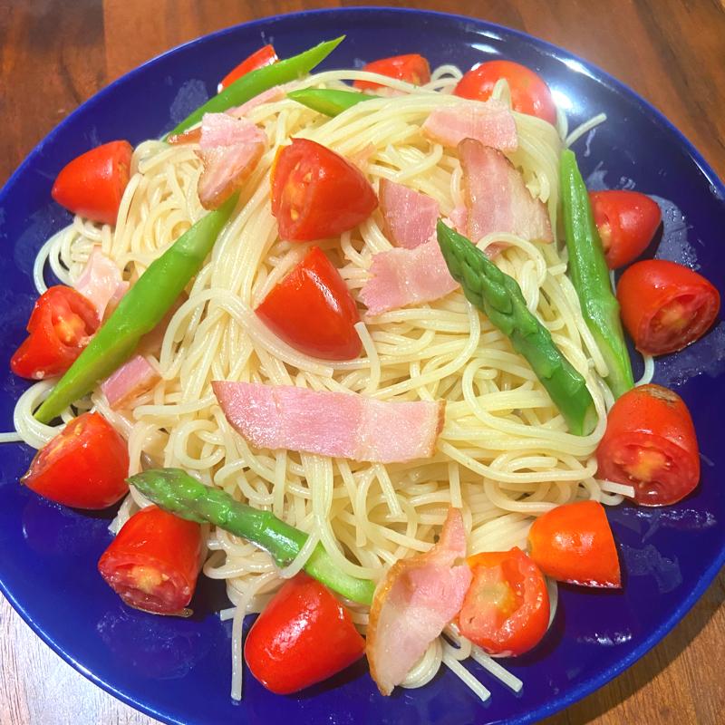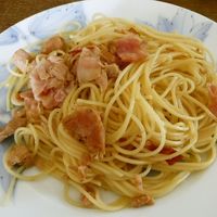 家にあるもので おうちランチ『アンチョビベーコンのパスタ』。