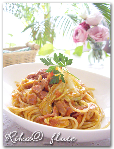 春キャベツとベーコンのアンチョビトマトクリームパスタ : Rika@_flute Cooking♪。