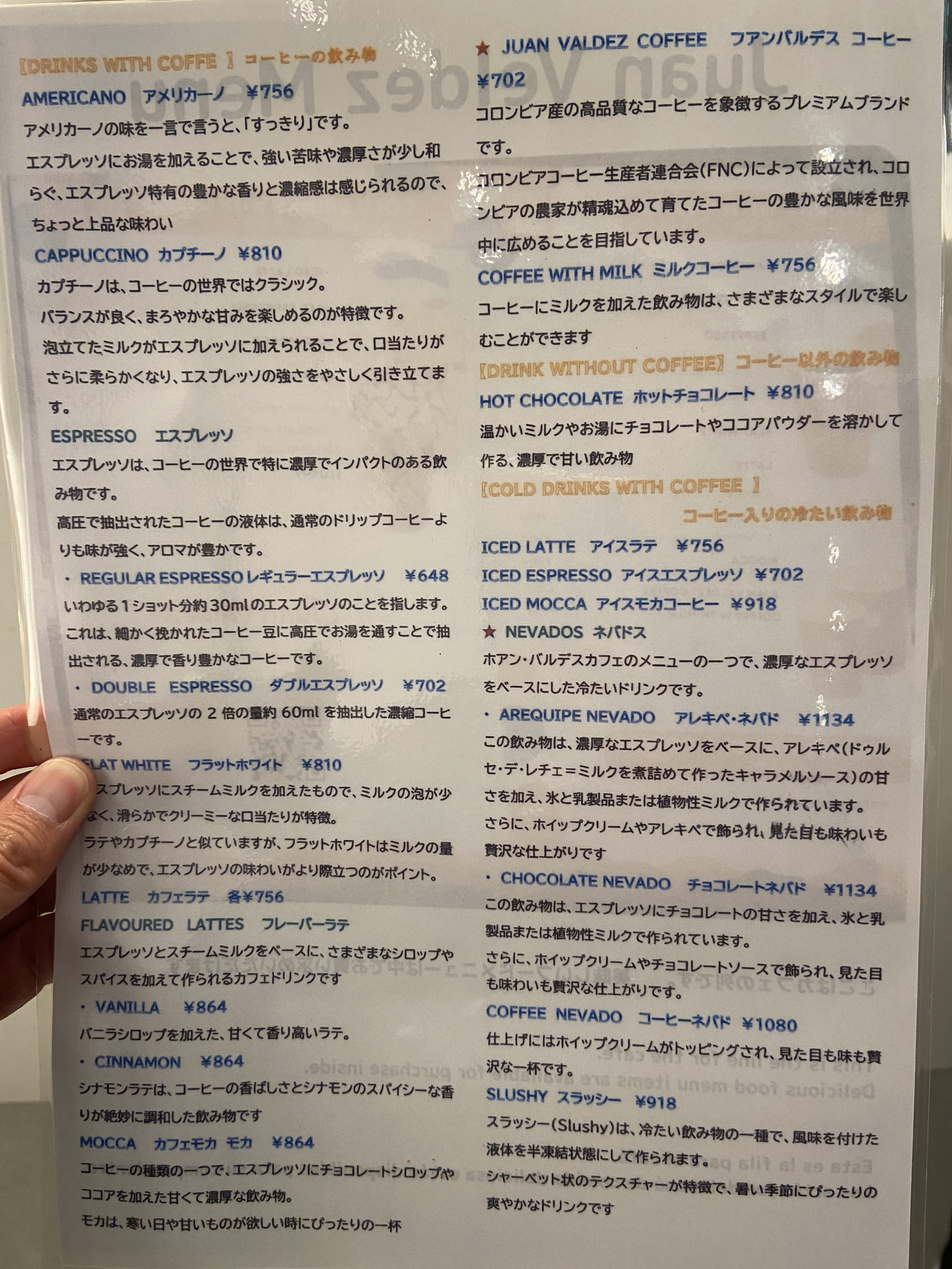 コロンビアのメニュー、読んでも何か分からないんだ😂ネ、ネバドスとは?とお姉さんに聞くと100万回質問されたんだろうな「スタバのフラペチーノみたいなものです!」とベストアンサーを作っていた。しかし、うん、1番上、読めないんだ。アレクイペ ?「キャラメル」だ。