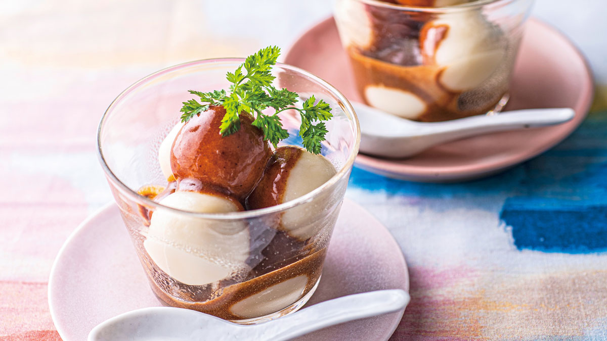 豆腐白玉のミルキーきな粉シロップ mio2020年8月号よりレシピClip。