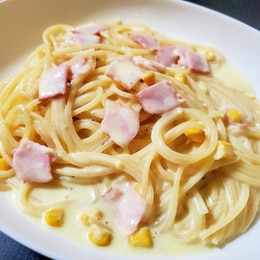コーンスープの素で簡単 コーンクリームの冷製スパゲティ。