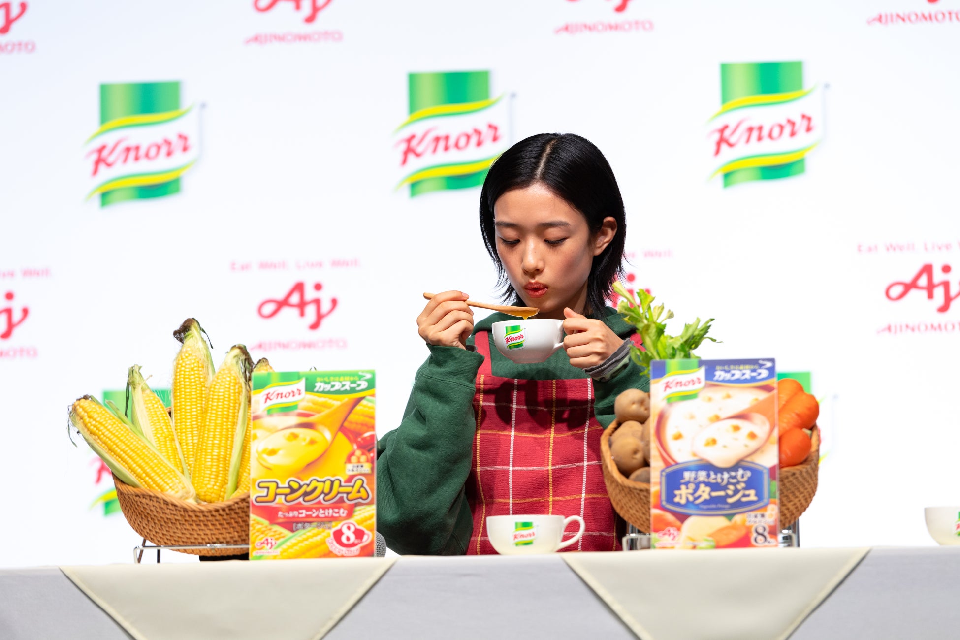 味の素㈱「クノール® カップスープ」新CM発表会>21代目CMキャラクター・河合優実さんが登場!“日常のシチュエーション”を思い浮かべながらコーンクリーム・ポタージュ・オニオンコンソメの3品種を実食味の素株式会社のプレスリリース。