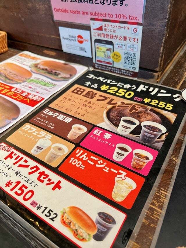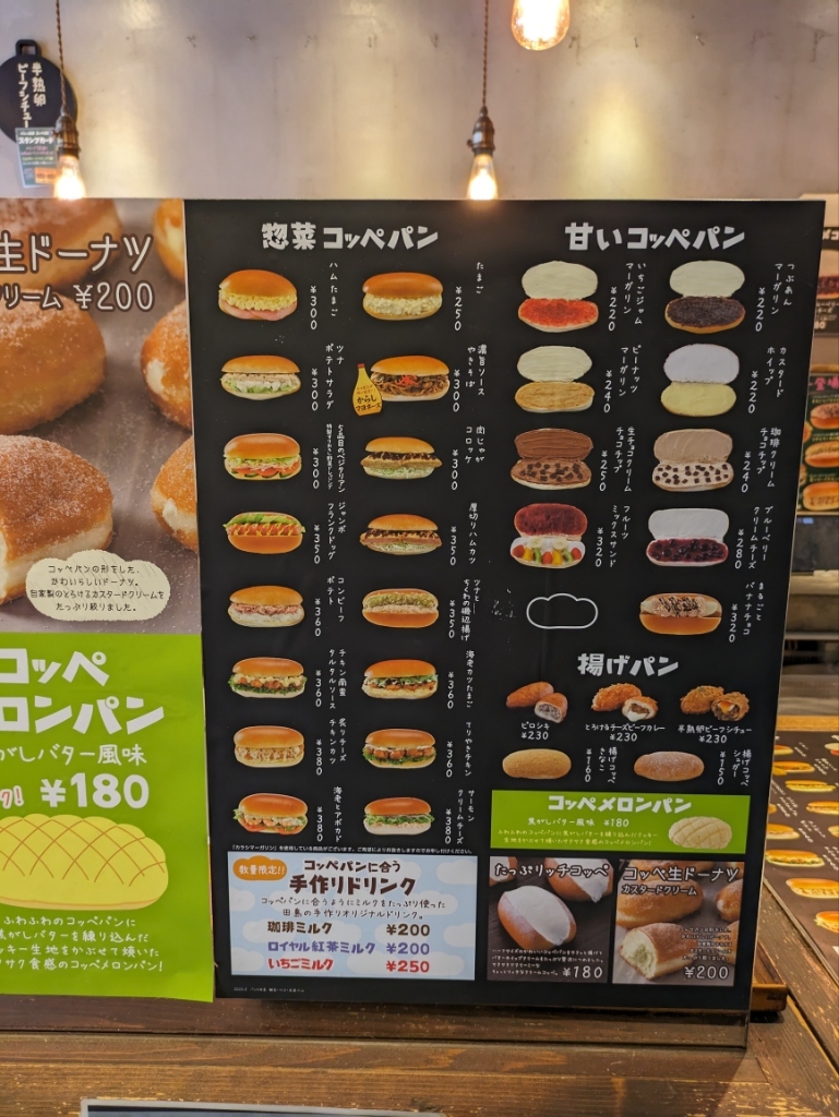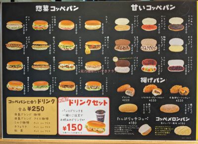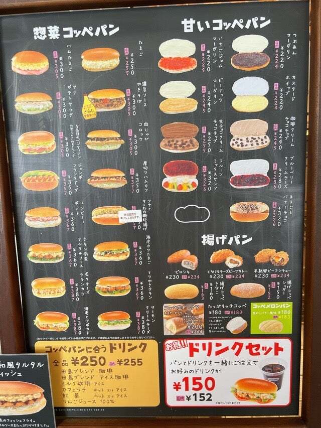 パンの田島・コッペ田島 メニュー表 2023年最新版 コッペパン・ドリンク・セット。