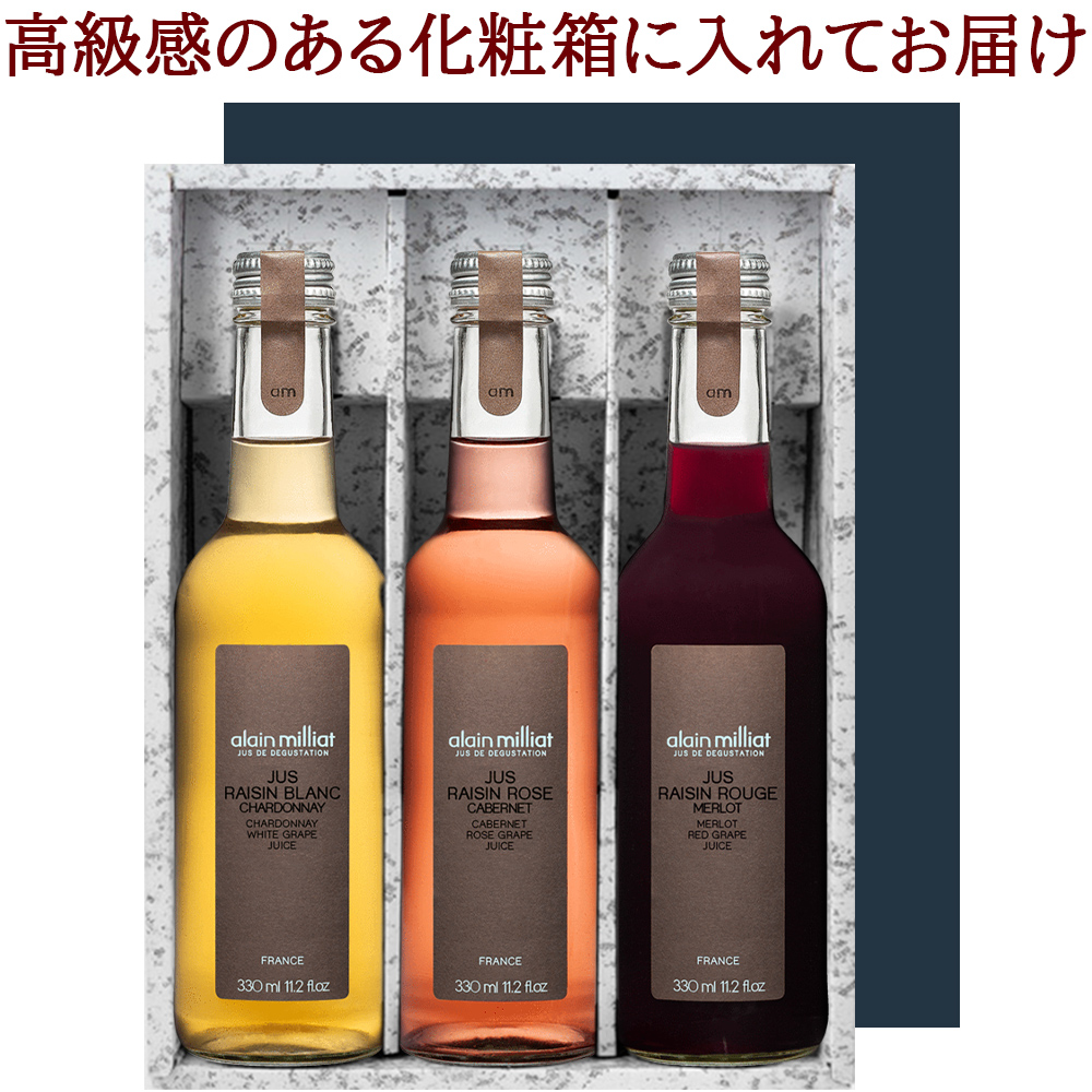お中元 ノンアルコール 高級 ジュース ギフト 詰め合わせ フランス産 アランミリア プレミアム 葡萄ジュース 果汁100% 330ml 3本 果物メルローカベルネ ソーヴィニヨン シャルドネ ノンアルコール 誕生日 出産内祝い 結婚内祝い:ワイン&ギフト オリジン・グルメ・JRE。