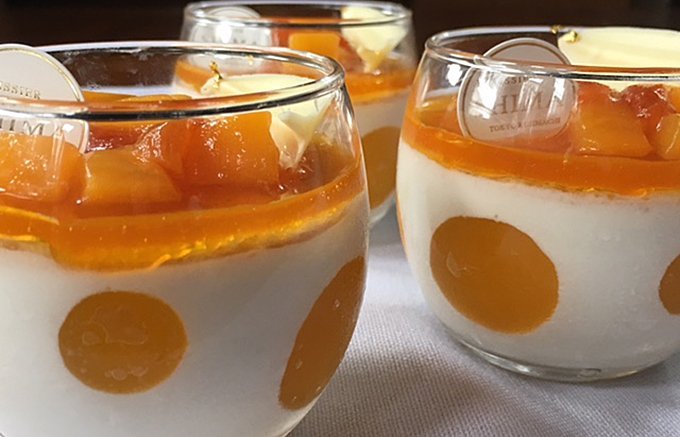 ベリーヌとは、フランス語のベール グラス とテリーヌを組み合わせた言葉で、透明なグラスやカップにテリーヌのように数種の味わいを重ねたスイーツのこと。まさに、暑くなるこれからの季節におすすめのひと品です! 写真は「ショコラアプリコ」。アプリコットの。