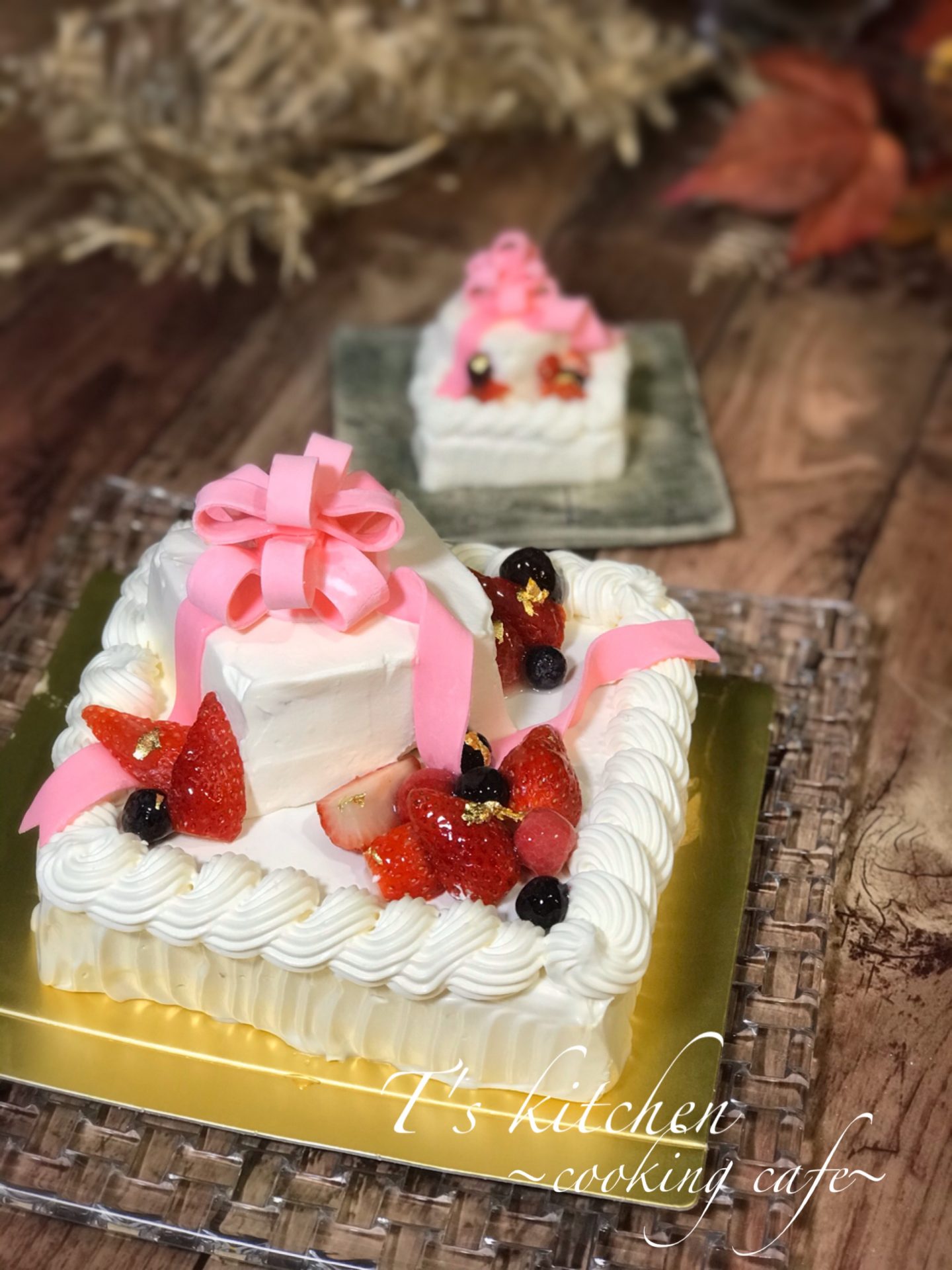 🎂2段ケーキ🎂 生デコレーションの6号サイズ 18㎝ と、 4号サイズ 12㎝ の2段のケーキです✨ チョコレートケーキとの組み合わせも出来ますので、ぜひお問い合わせください😊 特別な日にいかがでしょうか💖? S.Sプティエテpetitete茨城茨城スイーツ土浦。
