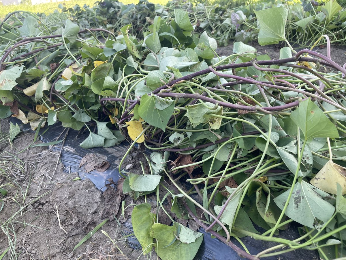 サツマイモの「つる返し」は、芋を太らせるための大事な作業。