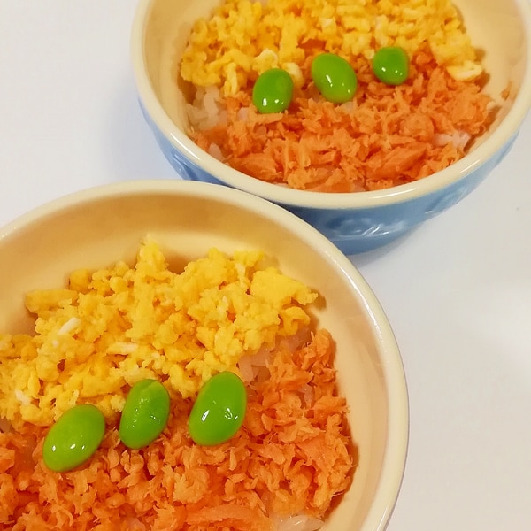 レンジだけでこどもご飯☆鮭×たまご×枝豆の三色丼。