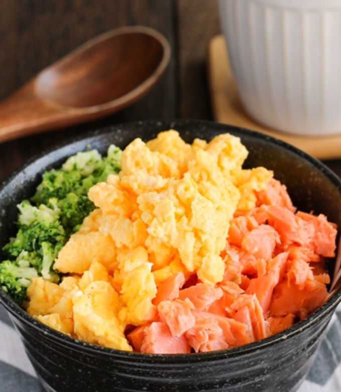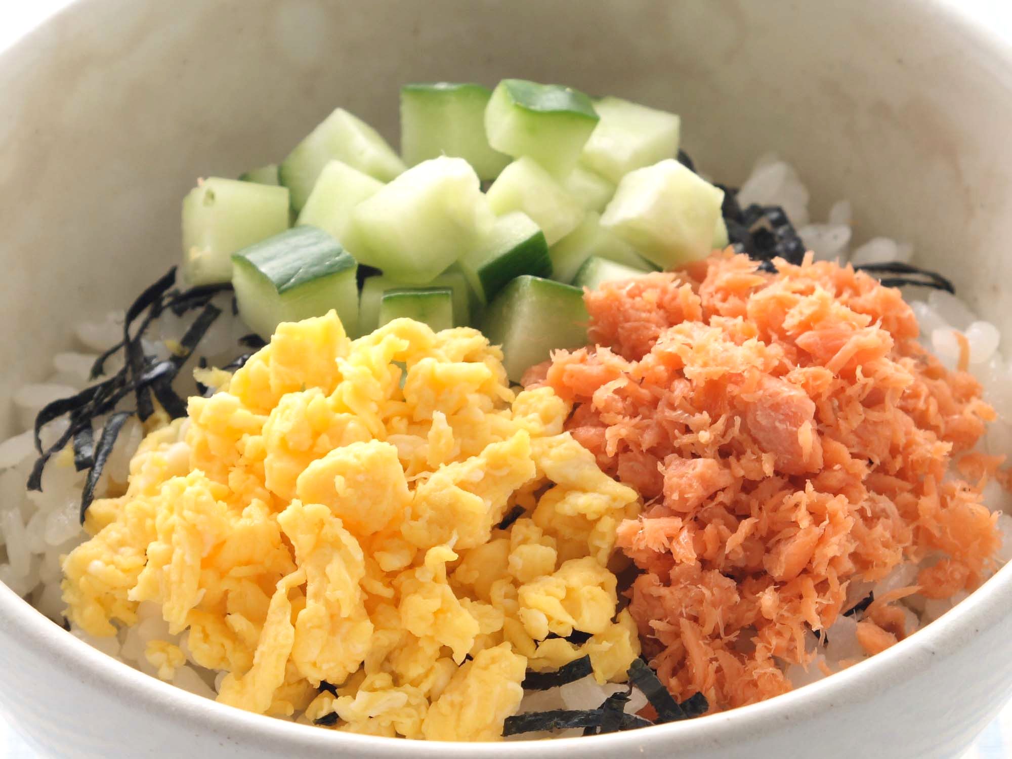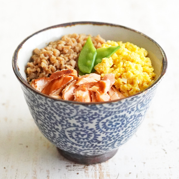 栄養バランスのよい焼き鮭ほぐし3色丼食事献立管理栄養士・調理師 とものうようこ トモ栄養バランスのとれた献立のつくり方。