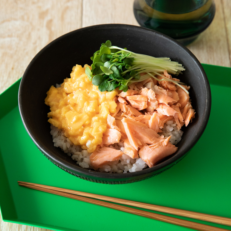 ほぐし鮭と炒り卵の3色丼のレシピ・作り方Happy Recipe ヤマサ醤油のレシピサイト。