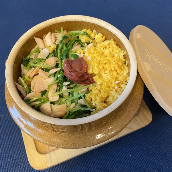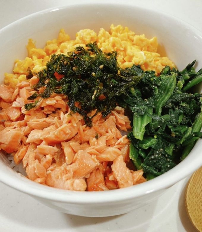 お肉好きの夫が喜ぶお魚ごはん♡『焼き鮭と小松菜と卵の三色丼』。