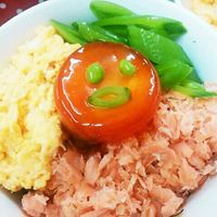 3色丼 たまご・さやえんどう・鮭フレーククラシル。