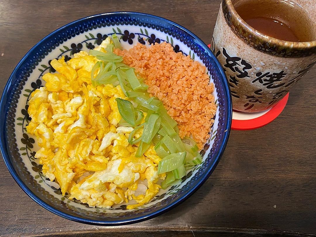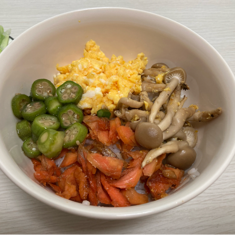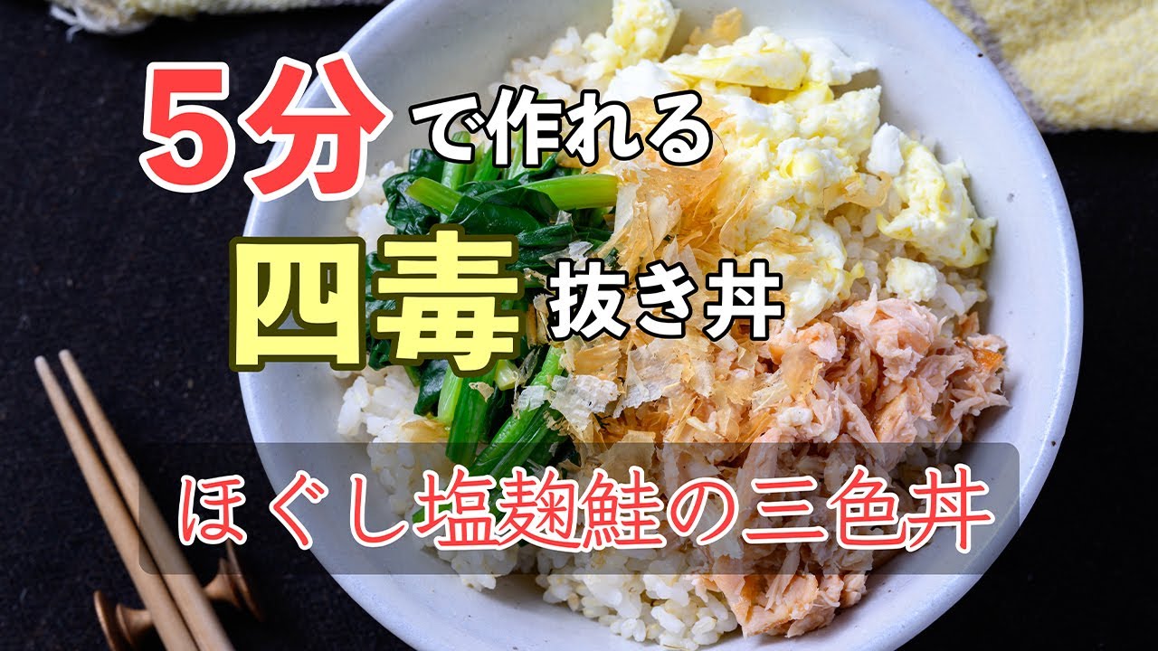 5分で出来る!4毒抜きスピード丼ほぐし塩麹鮭の三色丼焼いて鮭フレークを作っておけばアっという間にできる。