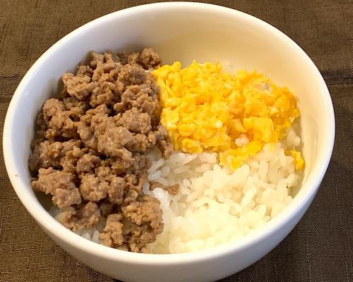 三色そぼろ丼 肉そぼろに卵と鮭の彩りをプラス!レシピオリーブオイルをひとまわし。
