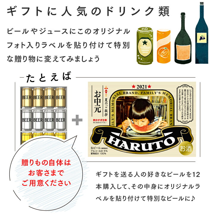 LINEで簡単♪ 缶 ビール フォト ラベル 12枚入 年末 年始 写真入り プレゼント オリジナル シール 祝い お祝い グッズ 部活 引退 卒業卒団 還暦 誕生日 父の日 ギフト 名入れ お歳暮 結婚 記念日 引き出物 出産 内祝い 退職 転勤 子ども 孫 写真 酒 記念品。