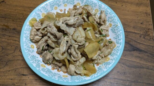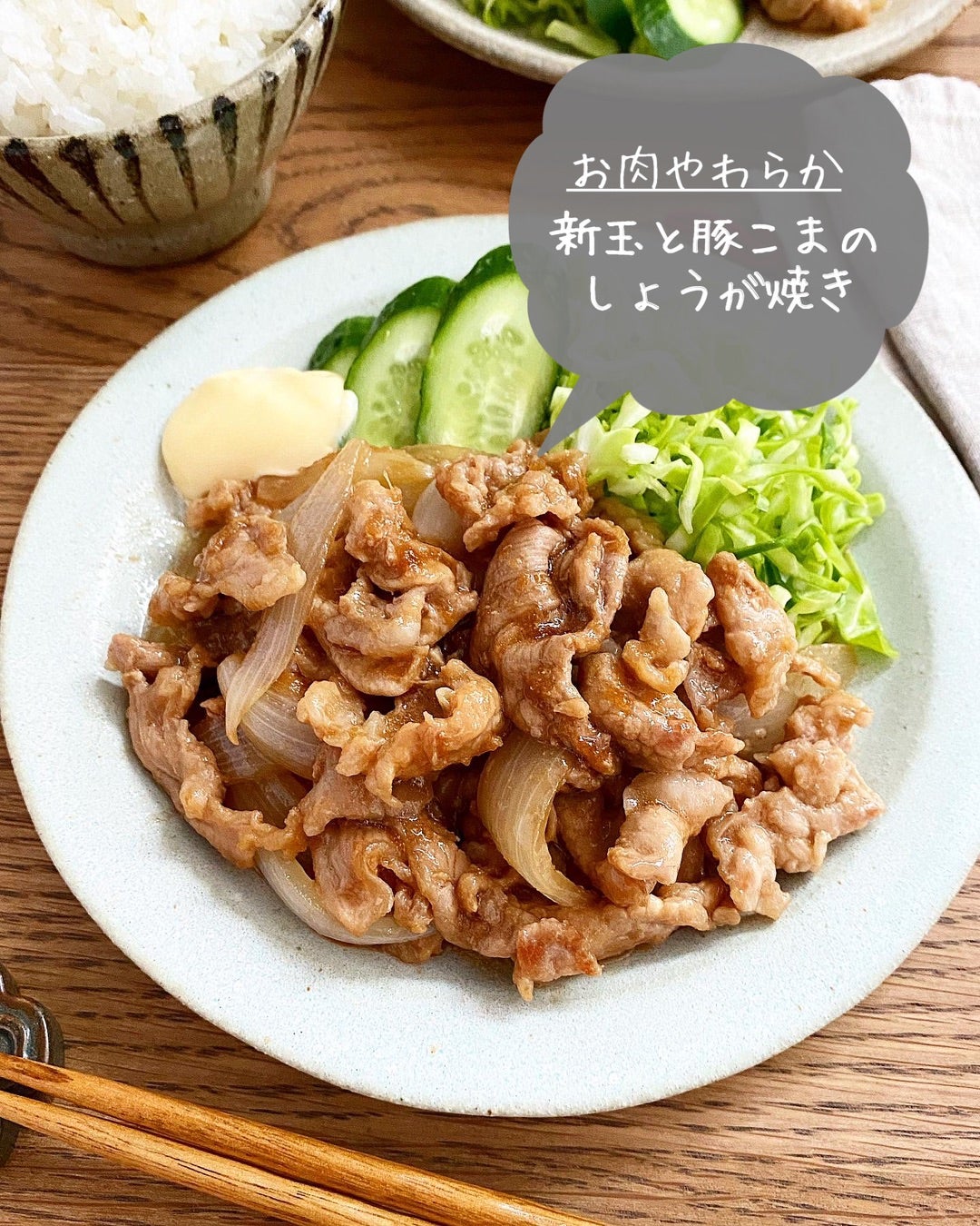 お肉やわらか新玉と豚こまの しょうが焼き簡単 節約。