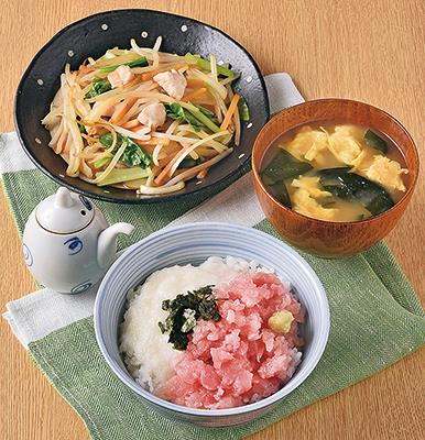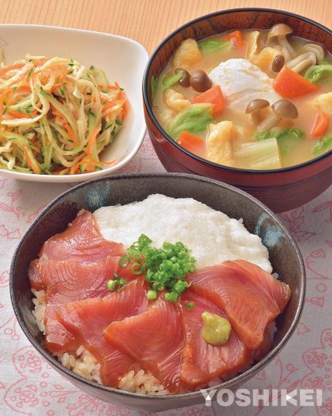 まぐろすきみの山かけ丼 肉野菜炒めかきたま汁 食材宅配のヨシケイ 夕食ネット レシピ・メニュー・献立付き。
