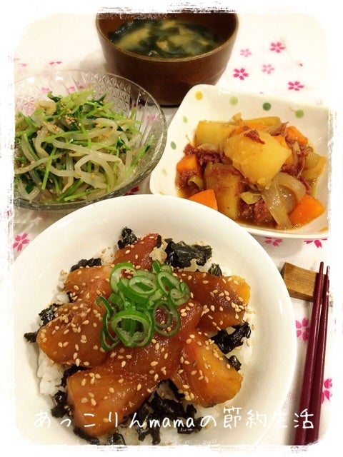 117円・ビンチョウマグロの漬け丼献立*〜あっこりんmamaの1男3女 6人家族の節約献立とお弁当日記〜*。