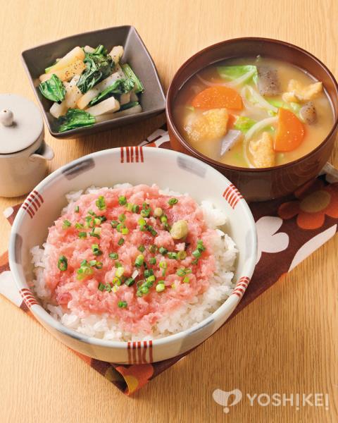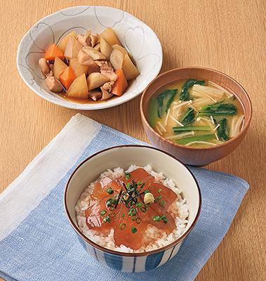 まぐろの漬け丼 根菜の田舎風煮えのきと青菜のみそ汁 食材宅配のヨシケイ 夕食ネット レシピ・メニュー・献立付き。